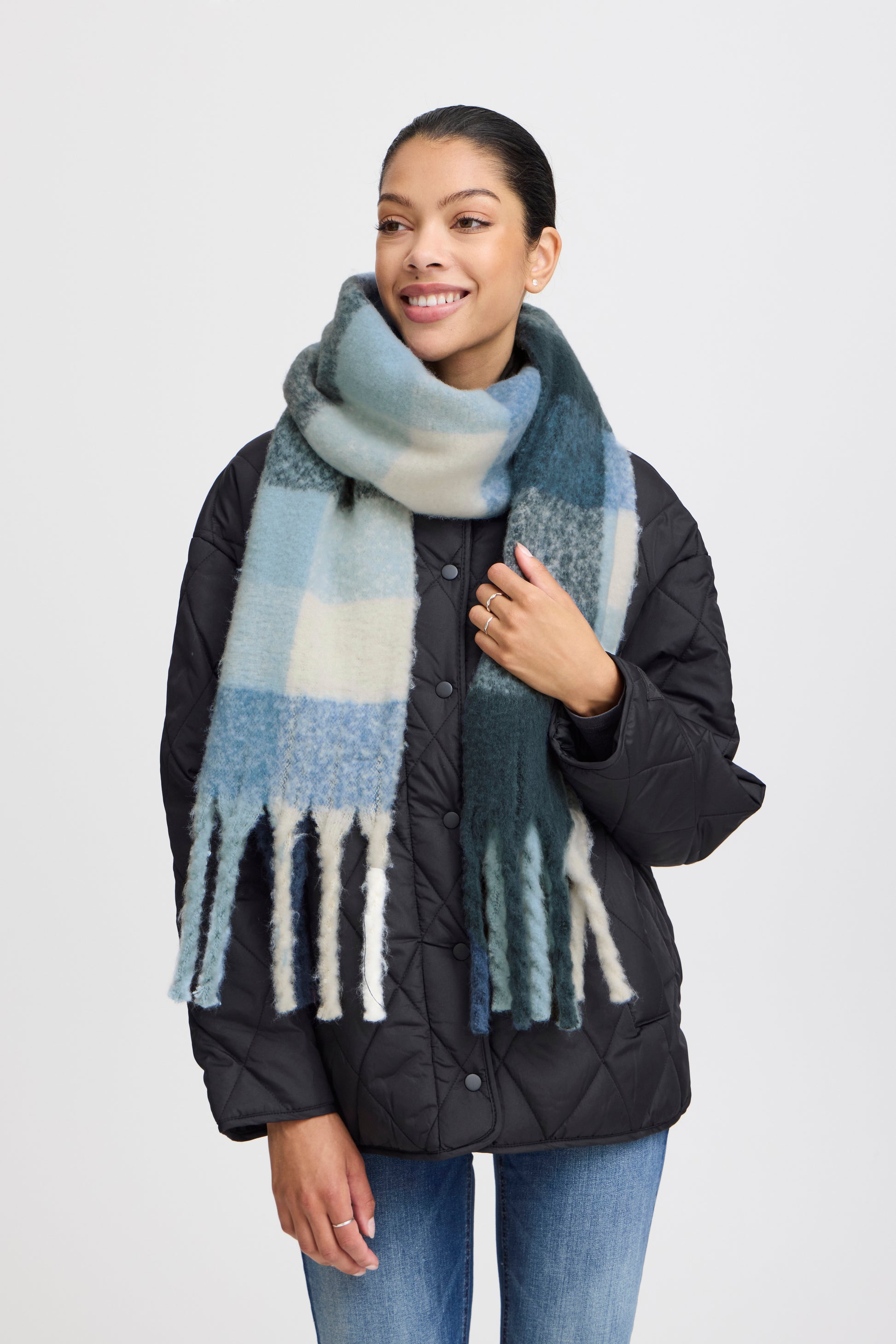 Dieser kuschelig weiche Schal in wunderschönen Blautönen mit Fransen hält Dich in der kalten Jahreszeit angenehm warm. Worauf wartest Du?